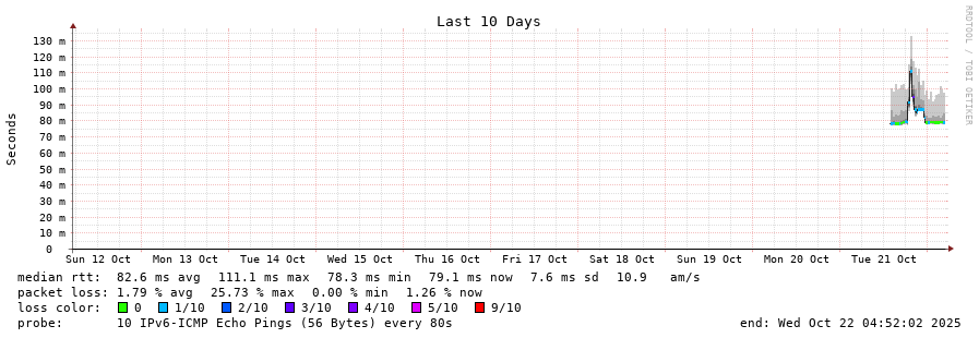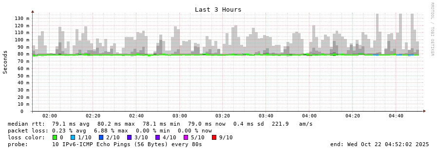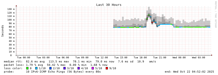 traceroute to 2001:470:1f13:814:1ad6:c7ff:fe2a:502 (2001:470:1f13:814:1ad6:c7ff:fe2a:502), 30 hops max, 80 byte packets - Generated at 2025-10-22 04:45:01